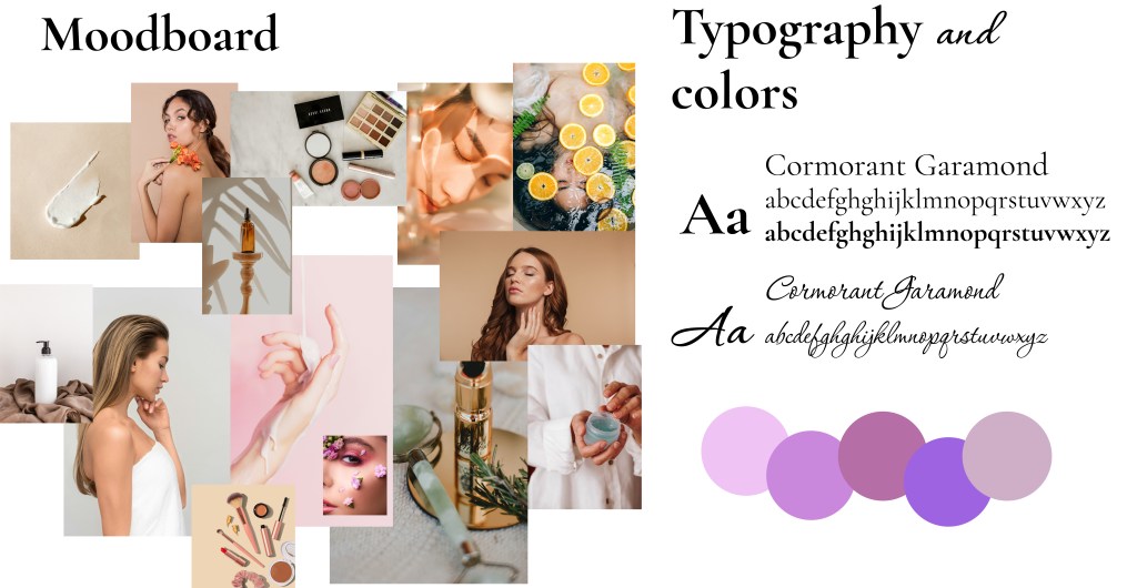 A curated moodboard guided the creative direction, showcasing soft textures, warm neutral tones, and organic imagery that evoke a sense of relaxation and skincare rituals. The color scheme consists of soft purples, muted pinks, and warm beige tones to enhance the brand’s premium identity.