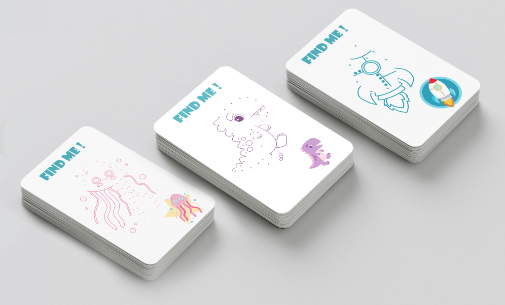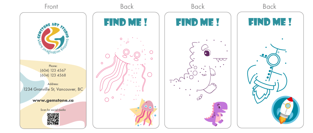 The business card for Gemstone Art Studio is more than just a contact card; it’s an interactive piece designed to engage the studio’s young audience. On the front side, there are studio’s logo, and important information. On the back of the card, a simple dot-to-dot puzzle game is presented, inviting children and teenagers to connect the dots and reveal a hidden image related to art or creativity. This interactive element not only adds an element of fun to the business card but also serves as a memorable and engaging touchpoint that reinforces the studio’s commitment to fostering creativity and playfulness.