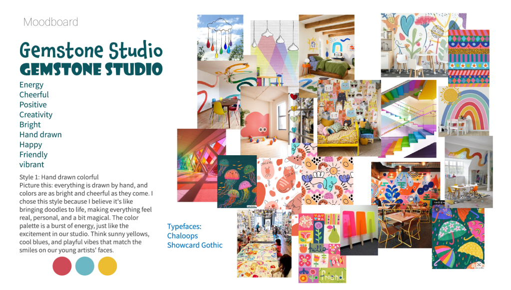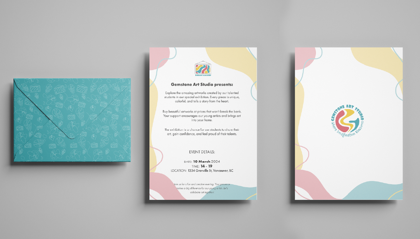The Gemstone Art Studio project was a resounding success, effectively establishing a dynamic space for young artists. Our strategic design choices, such as the vibrant color palette and playful typefaces, resonated well with the target audience. Moving forward, we aim to enhance engagement through digital interactivity and innovative print techniques. A key takeaway is the importance of maintaining consistency in design across different mediums to reinforce brand identity, guiding our approach in future endeavors.