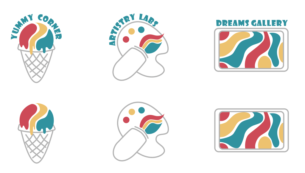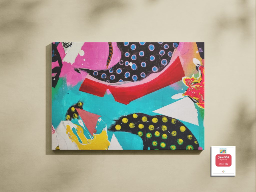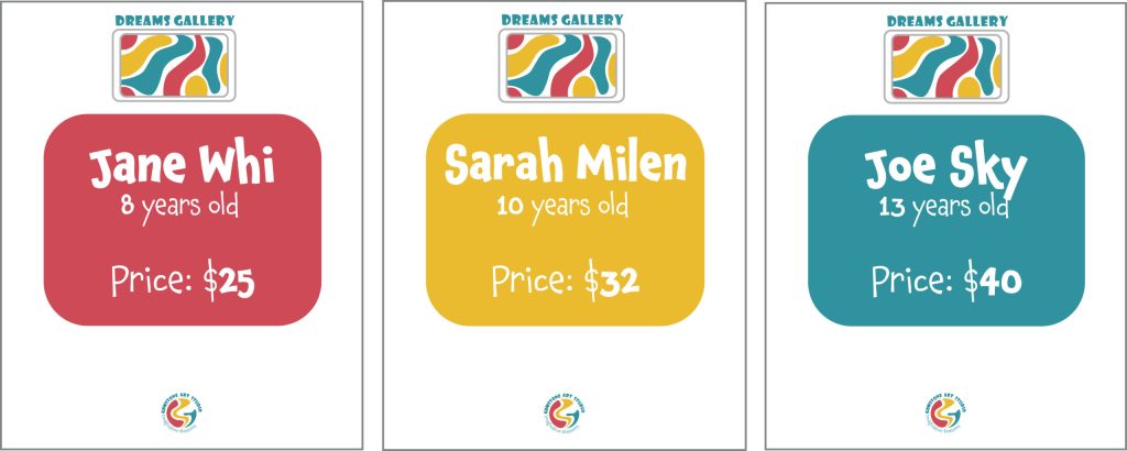 For “Dreams Gallery” which is the exhibition section. These labels will be used for artists’ artwork introduction, including their name, their age, and the price of the artwork. The color of labels is different based on artists’ levels, red for beginner, yellow for intermediate, and blue for advanced.