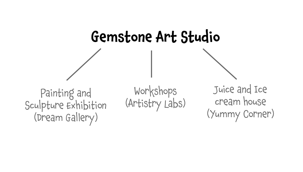 1) workshop, 2) Painting and Sculpture exhibition, and 3) Juice and ice cream house.