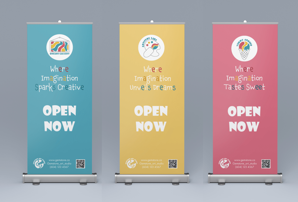 Three banners are designed for use inside the studio to introduce the departments. Each banner features the icon of its respective department, along with a tagline inspired by the studio’s main tagline, but customized for each department. Additionally, each banner showcases a different color from the brand’s palette. The phrase “OPEN NOW” is prominently displayed on each banner. Finally, each banner includes contact information and a QR code for easier access.