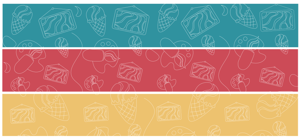 This design is for ice cream cone sleeves sold in the Yummy Corner department. It features the department’s icon, a red-patterned background suitable for food, and the studio’s secondary logo.