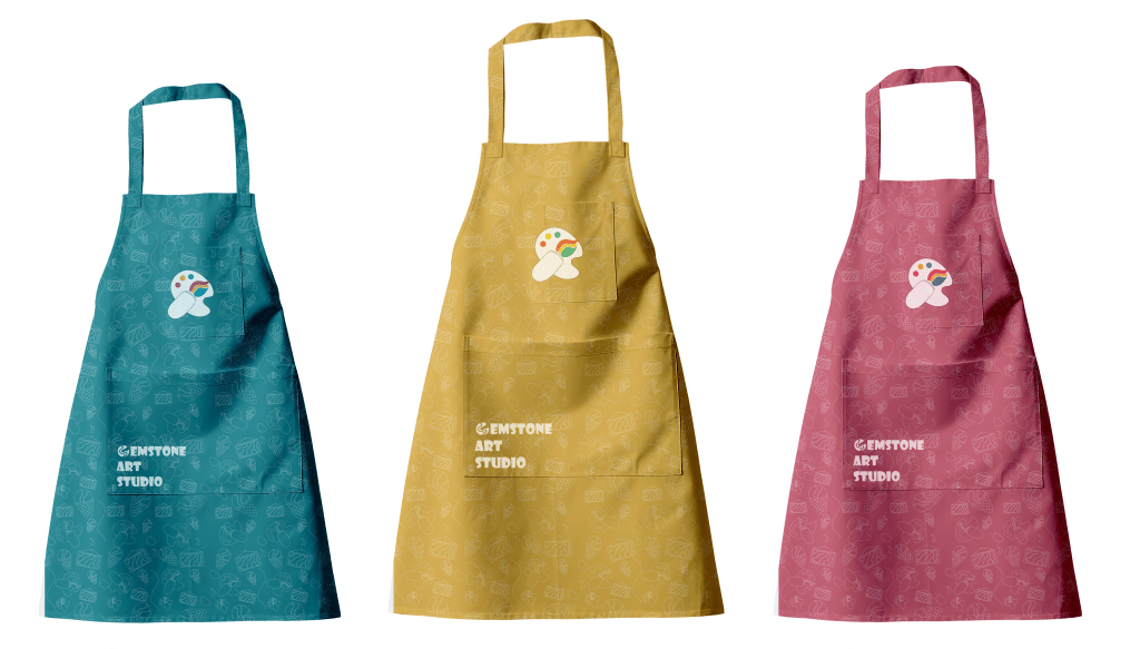 Aprons in three different colors for the “Artistry Lab” department for students in three levels, the red one for beginners, the yellow one for intermediates, and the blue one for advanced students.