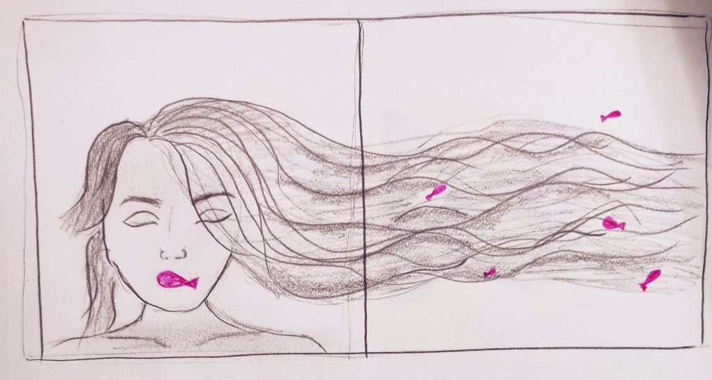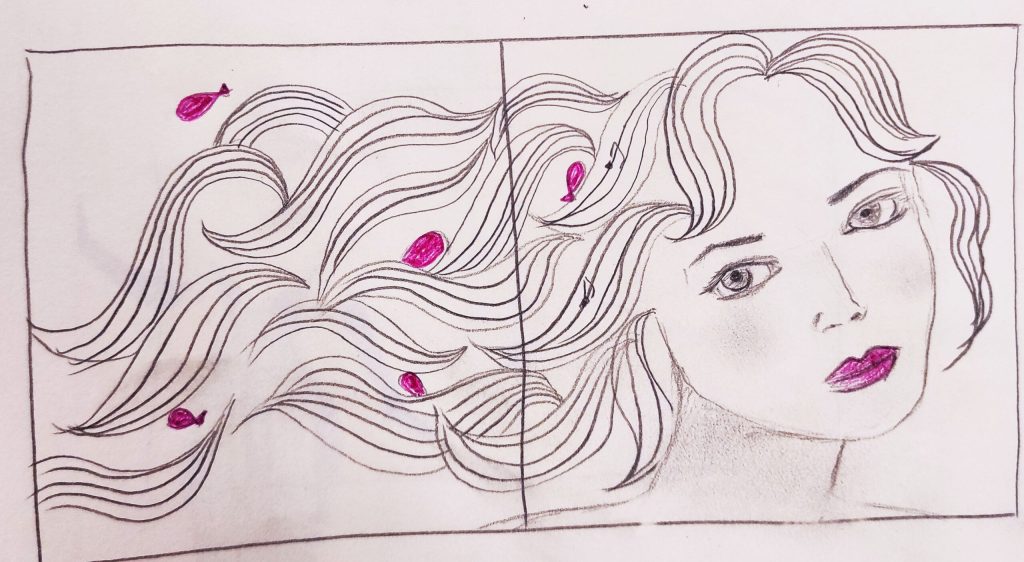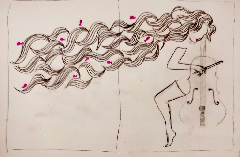 In the design, the woman playing the cello is depicted using a closure technique, where essential details are suggested rather than explicitly outlined, inviting viewers to actively engage with the artwork and fill in the gaps with their imagination. The use of the closure technique imbues the composition with a sense of mystery and allure, encouraging viewers to delve deeper into the narrative of the artwork. Hidden within the strands of hair, there are little red-orange fishes swimming around. They bring a fun and playful vibe to the picture, making it more lively and cheerful.