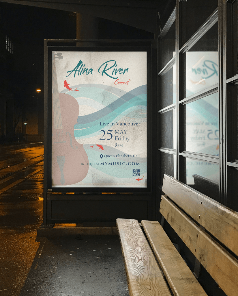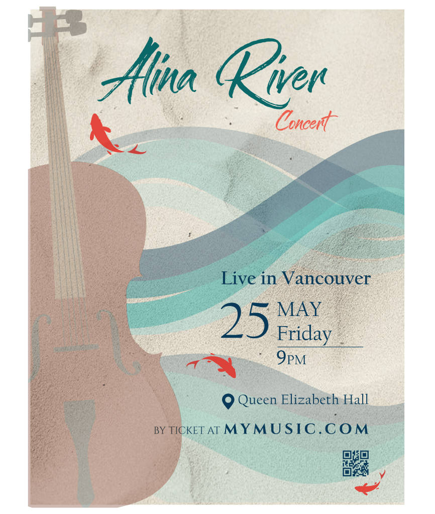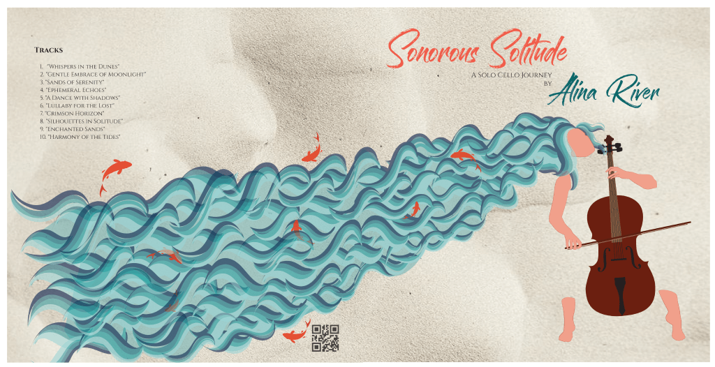 For the concert poster, the focus shifts from the visual representation of the cellist to a more minimalist approach, highlighting essential information such as the date, time, location, and other pertinent details. With its clean and simpler layout, the concert poster effectively conveys essential information while capturing the essence of “Sonorous Solitude.” It serves as a captivating invitation for audiences to embark on a journey of musical discovery and contemplation, promising an unforgettable evening filled with enchanting melodies and heartfelt performances by Alina River.