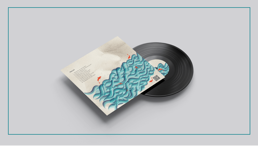 For the banner advertising the concert at the sky train station, a larger rectangular format allows for a more expansive display of the artwork. Building upon the captivating design of the vinyl cover, the banner features the central imagery of the cellist playing amidst the tranquil beach setting, with her hair flowing like waves of the sea and red-orange fishes darting playfully. Incorporating the essential information about the concert, such as the date, time, location, and ticket details, the banner ensures that passersby are informed about the upcoming event.